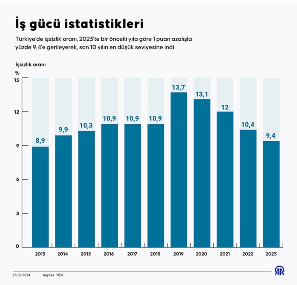 2024 yılında Türkiye İstatistik Kurumu (TÜİK) verileri, ülke genelinde işsizlik oranının son 12 yılın en düşük seviyesine gerilediğini gösterdi: İşsizlik %8,7’ye düştü.